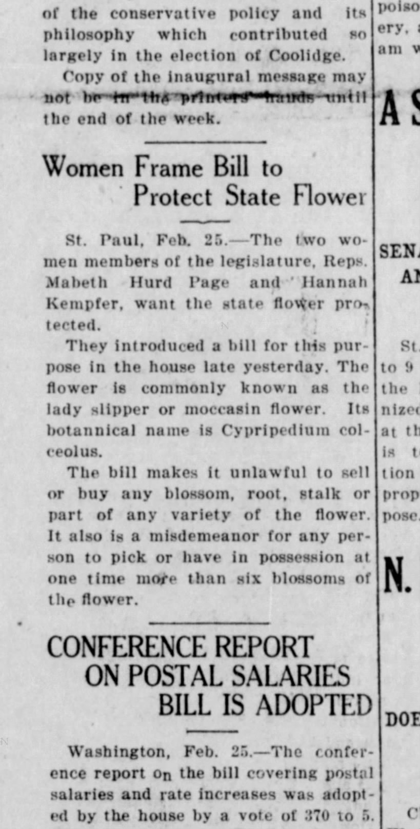 By 1922, the state flower was being over-harvested and was on the brink of extinction. Women had gained the right to vote almost two years earlier. Minnesota was proudly represented by FOUR female state legislators. Two of them, Hannah Kempfer and Mabeth Hurd Paige, were at the forefront of the conservation movement. They proposed a bill to outlaw the sale of the dwindling emblem. It would be illegal to uproot the Lady Slipper. Even if the orchid grew on your own property, it would be illegal to sell it without getting prior written permission from the Secretary of State.